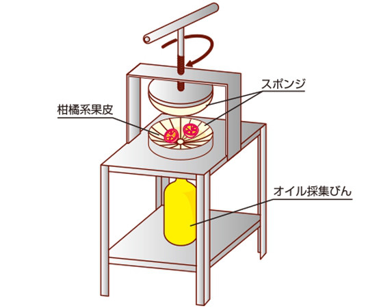 柑橘系の精油は熱に弱いため、ほとんどがこの圧搾法による抽出が行われています。さわやかなでフレッシュな香りをそのまま取り出します。