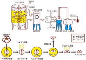 このコンクリートにエタノールを加えてよく溶かし、香りを移し、冷浸法と同じようにエタノールを蒸発させて芳香成分を得ます。